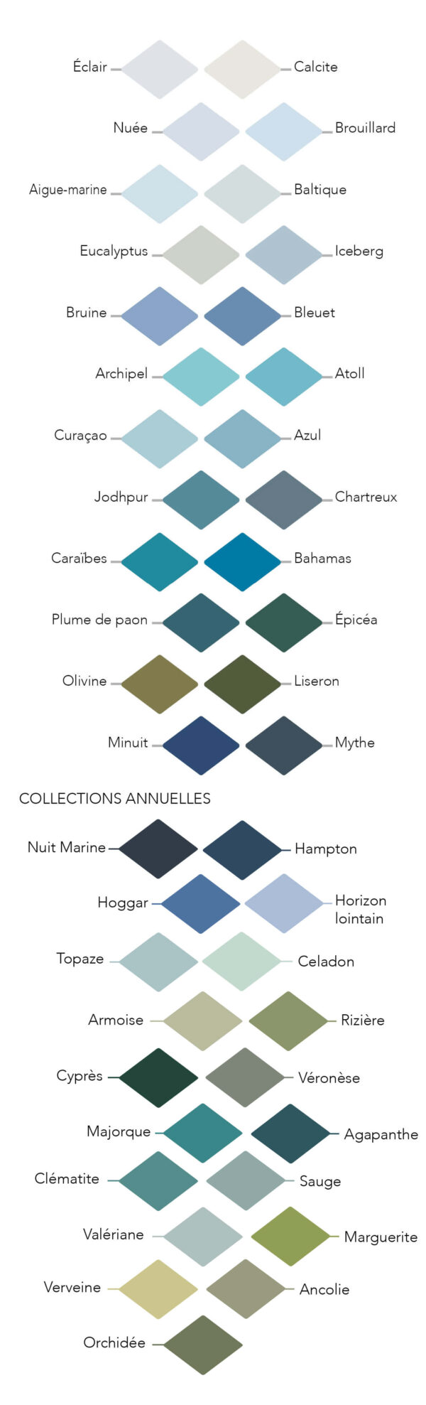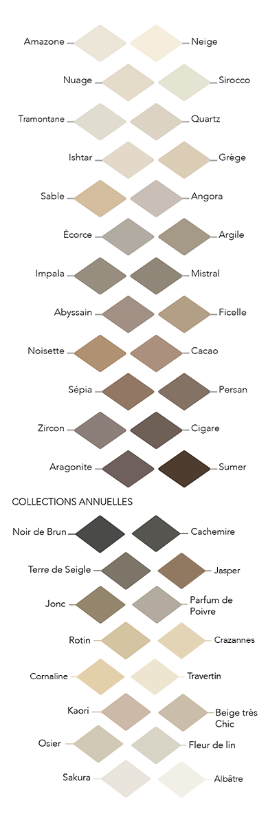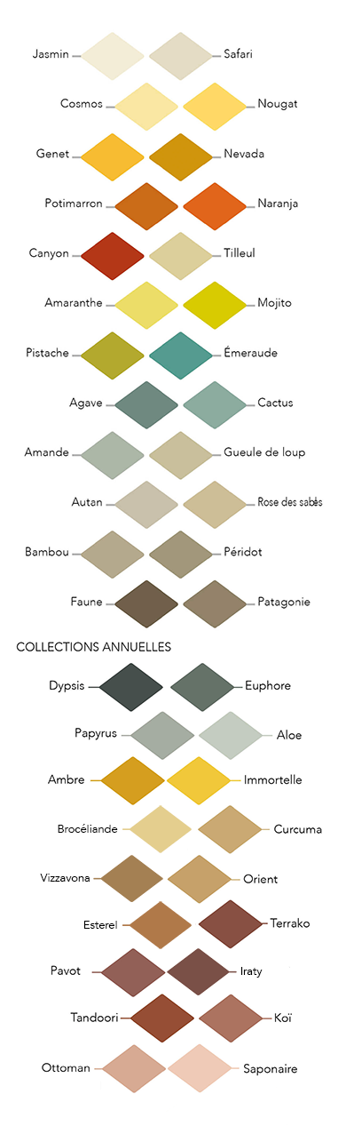 Voici les couleurs disponibles pour mes peintures naturelles et de fabrication française (votre écran / luminosité peut affecter les nuances de couleur affichées).